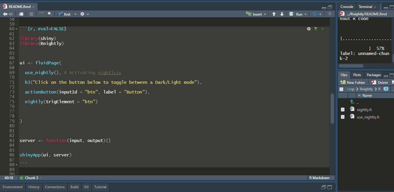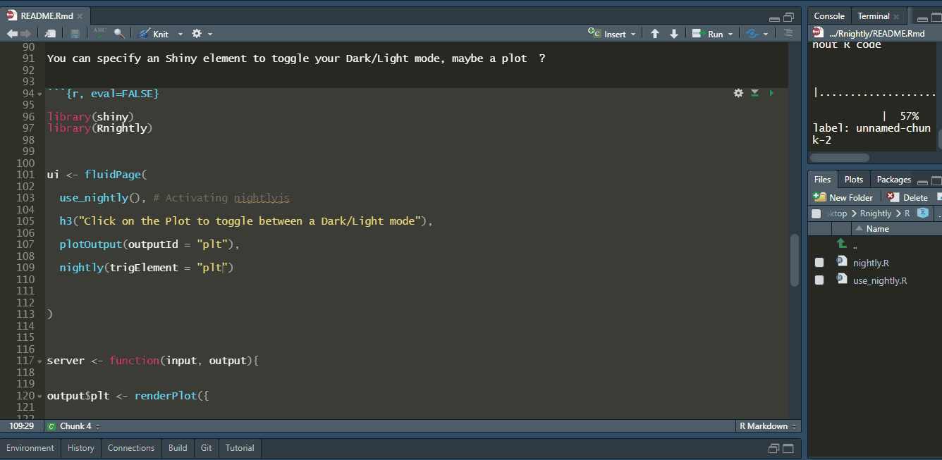Let’s create a basic shiny app that demonstrates the features of Rnightly. Here the trigElement will determine which shiny element will trigger the Dark/Light mode. Note that it’s the only mandotry argument: