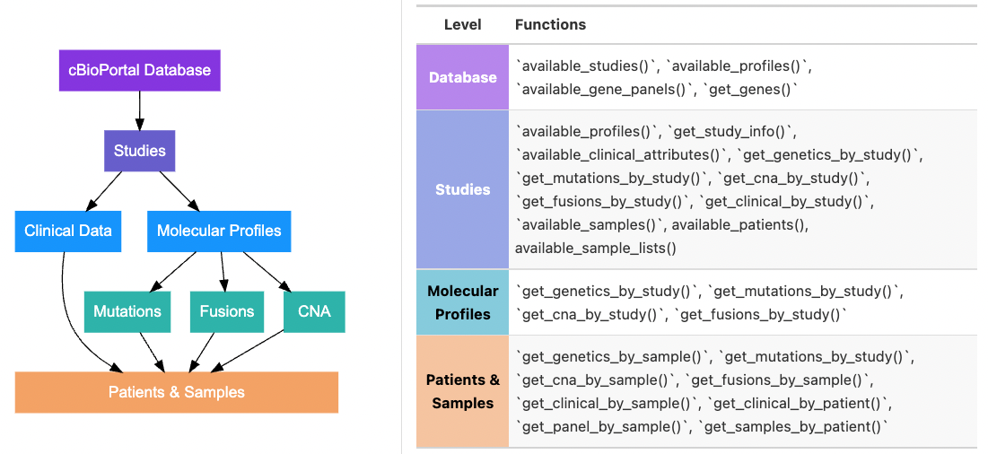There are many ways to identify and pull data (e.g. by study ID, by sample ID, by molecular profile ID). Having an understanding of how data is organized in cBioPortal will help you determine which functions you need. The figure below outlines the general data schema for cBioPortal and which functions access which levels of the schema: