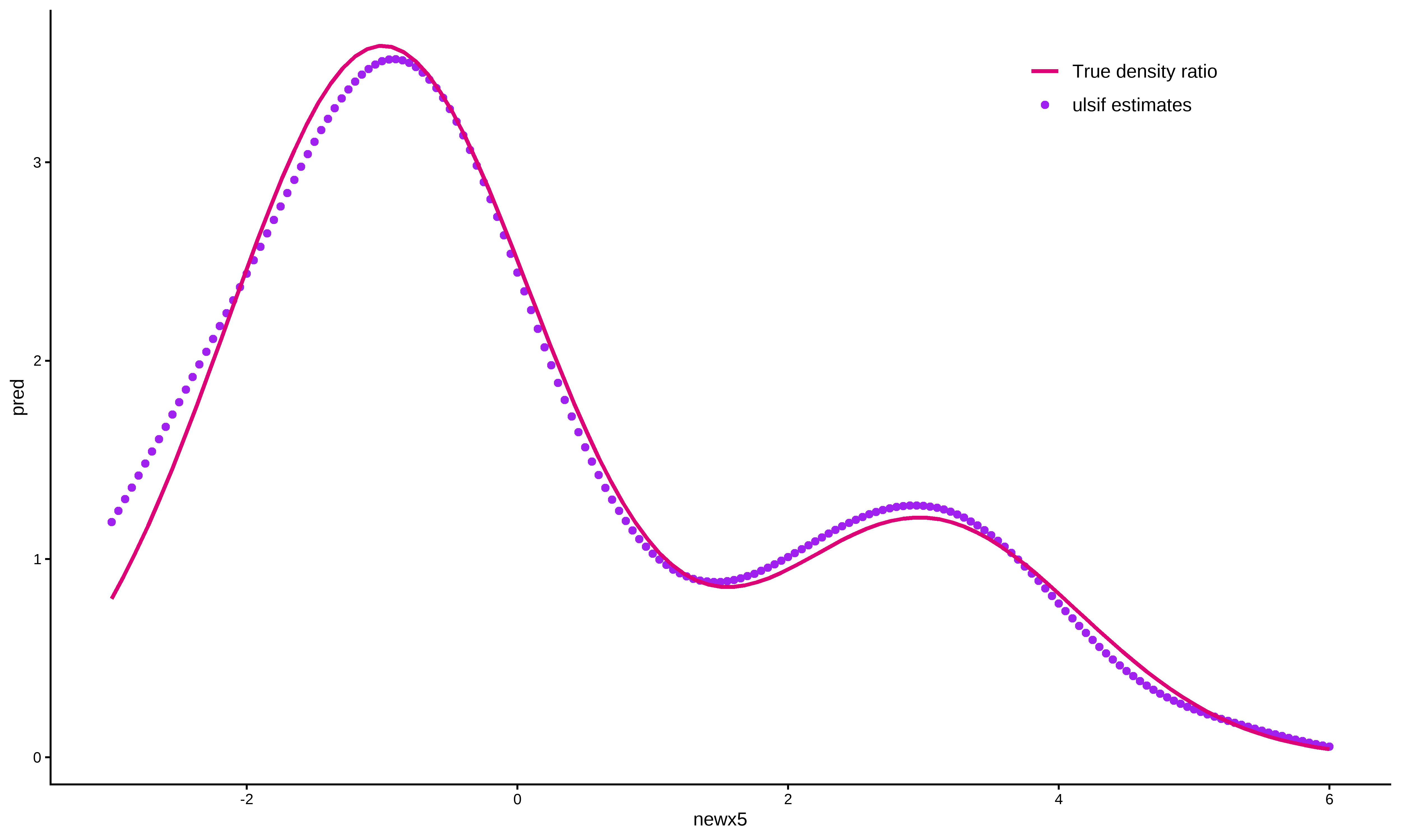 geom_point(aes(x = newx5, y = pred, col = "ulsif estimates")) +