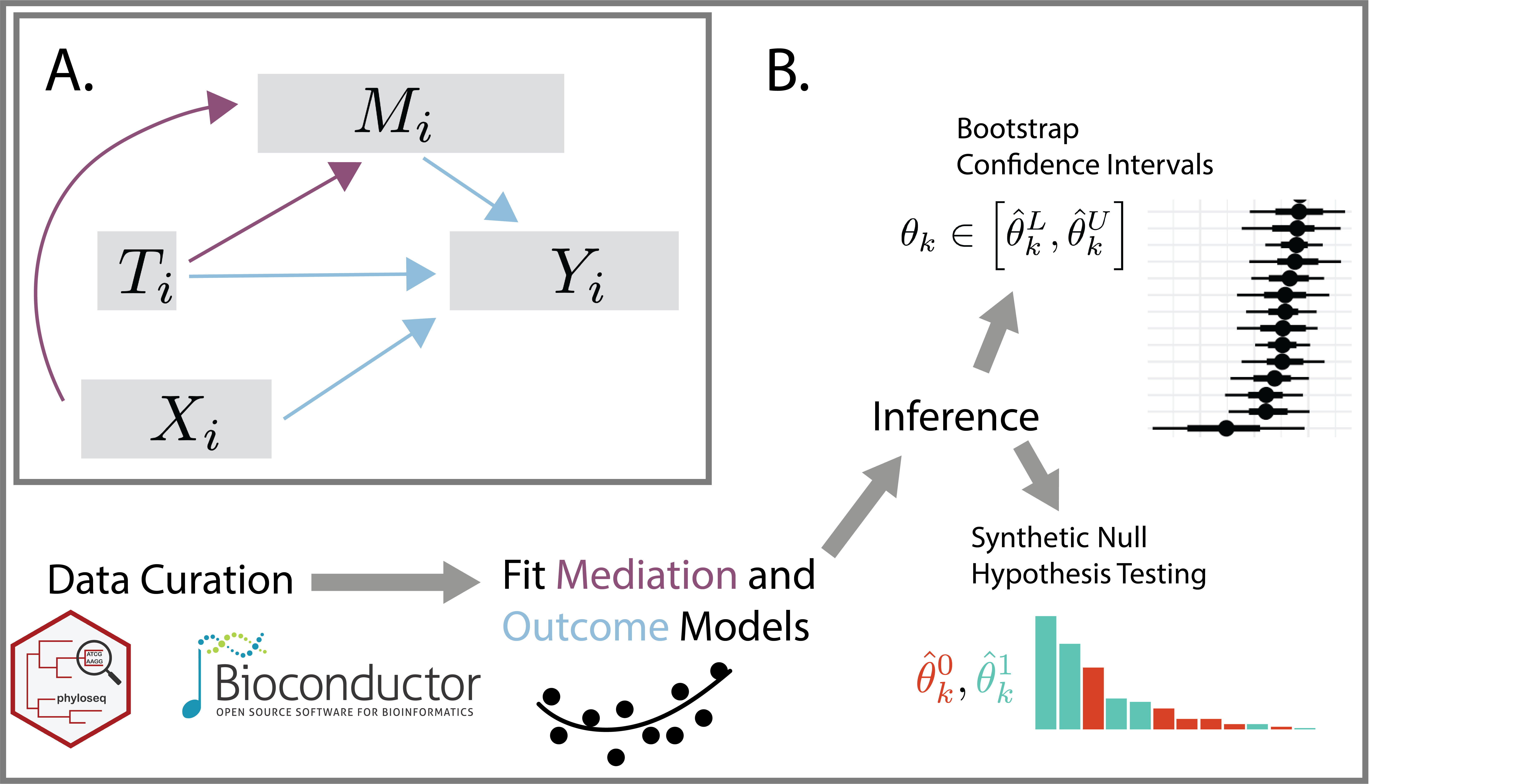 Next, we fit all mediation analysis components and estimate effects. By default, the package uses linear models – see the vignettes for examples using sparse regression, random forests, and bayesian hierarchical models instead.