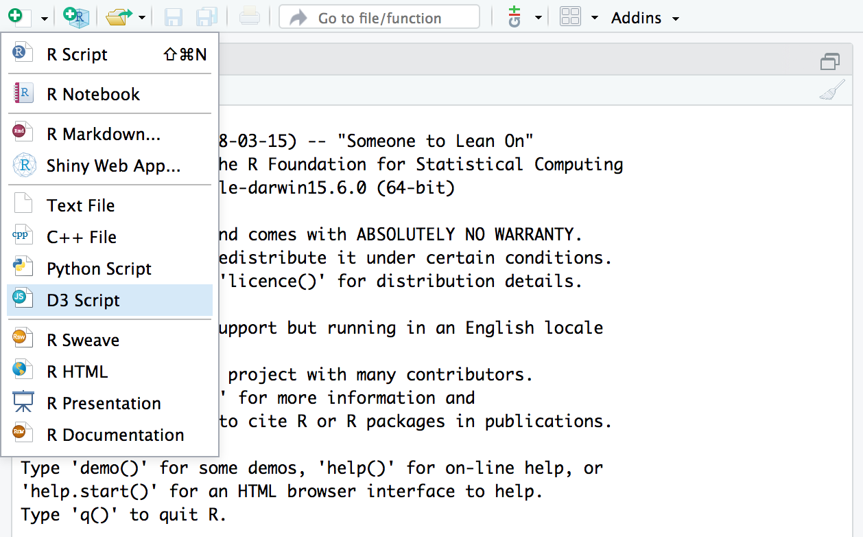 Next, install the preview release of RStudio v1.2 of RStudio (you need this version of RStudio to take advantage of various integrated tools for authoring D3 scripts with r2d3).